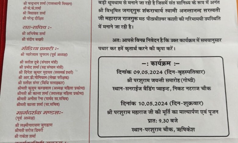 ऋषिकेश। श्री परशुराम महासभा द्वारा आयोजित होने जा रही भगवान परशुराम जयंती के संदर्भ में एक तैयारी बैठक का आयोजन देहरादून रोड में किया गया जिसमें परशुराम महासभा के अध्यक्ष श्री संदीप शास्त्री द्वारा 8 एवं 9 मई को आयोजित होने वाली परशुराम जयंती की तैयारी को अंतिम रूप दिया गया सभा के अध्यक्ष द्वारा बताया गया कि 8 मई को प्रातः 10:00 बजे सनराइज वेडिंग पॉइंट में भगवान परशुराम जयंती की उपलक्ष में एक गोष्ठी का आयोजन किया जाएगा तथा 10 मई को भगवान परशुराम जी को जन्मोत्सव के रूप में परशुराम चौक पर भगवान परशुराम जी की मूर्ति पर पूजा अर्चना कर दो दिवसीय परशुराम जयंती के कार्यक्रम का समापन किया जाएगा उपरोक्त सभी कार्यक्रमों में नगर के सभी राजनीतिक एवं सामाजिक सम्मानित लोगों को आमंत्रित किया जाएगा तथा 9 में को गोष्टी के रूप में भगवान परशुराम जी की जयंती में संत सानिध्य के रूप में अनंत श्री विभूषित जगतगुरु शंकराचार्य स्वामी अनंन्तान्द सरस्वती जी महाराज काशी से विशेष रूप से अपना मुख्य मार्गदर्शन एवं आशीर्वाद प्रदान करेंगे अतः सभी धर्म अनुरागी महानुभावों से निवेदन है कि 9 तारीख को अधिक से अधिक संख्या में भगवान परशुराम जी की जयंती को मनाने के लिए उपरोक्त कार्यक्रम में अपनी उपस्थिति रहे बैठक में सभा के अध्यक्ष संदीप शास्त्री मीडिया प्रभारी प्यारेलाल जुगरण महासचिव अरुण शर्मा आर०डी० गौनियाल डीके मुद्गल राकेश कडंवाल विनोद कोठारी दीपेंद्र शर्मा केके शर्मा भारत भूषण वाली। राज्य महिला आयोग की अध्यक्षा श्रीमती कुसुम कंडवाल ओम प्रकाश शर्मा श्रीकांता शर्मा अनीता रैना सरोज डिग्री रीना शर्मा पार्षद नरेंद्र दीक्षित राकेश कंडवाल मदन कुमार शर्मा आदि उपस्थित रहे