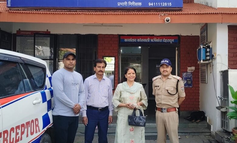 ऋषिकेश, 02 जून : कोतवाली ऋषिकेश द्वारा प्राप्त सुचना के अनुसार आज दिनांक 02-06-2025 को श्रीमती सरिता भट्ट पत्नी श्री जगतराम भट्ट् निवासी चोपड़ा फार्म श्यामपुर द्वारा थाना ऋषिकेश जनपद देहरादून कोतवाली मे आकर एक लिखित प्रार्थना पत्र दिया गया कि मेरा पर्स बाजार मे कही गिरकर खो गया है जिसमे मेरा एक एप्पल का फोन व एक लाख रूपये थे उक्त क्रम मे प्रभारी निरीक्षक कोतवाली ऋषिकेश प्रदीप राणा के आदेशानुसार पुलिस टीम को पीड़िता के साथ उनके पर्स की ढूंढखोज हेतु क्षेत्र मे भेजा गया पुलिस टीम द्वारा पतारसी / सुरागरसी कर मेन बाजार ऋषिकेश से एक दुकान के बाहर सड़क किनारे पड़े पर्स को व उसके अन्दर एक मोवाइल फोन एप्पल व एक लाख रूपये नगद व अन्य सामान को सही सलामत ढूंढकर श्रीमती सरिता भट्ट के सुपुर्द किया गया । श्रीमती सरिता भट्ट के द्वारा पुलिस टीम की भूरी – भूरी प्रसंसा कर धन्यवाद प्रकट किया गया ।
